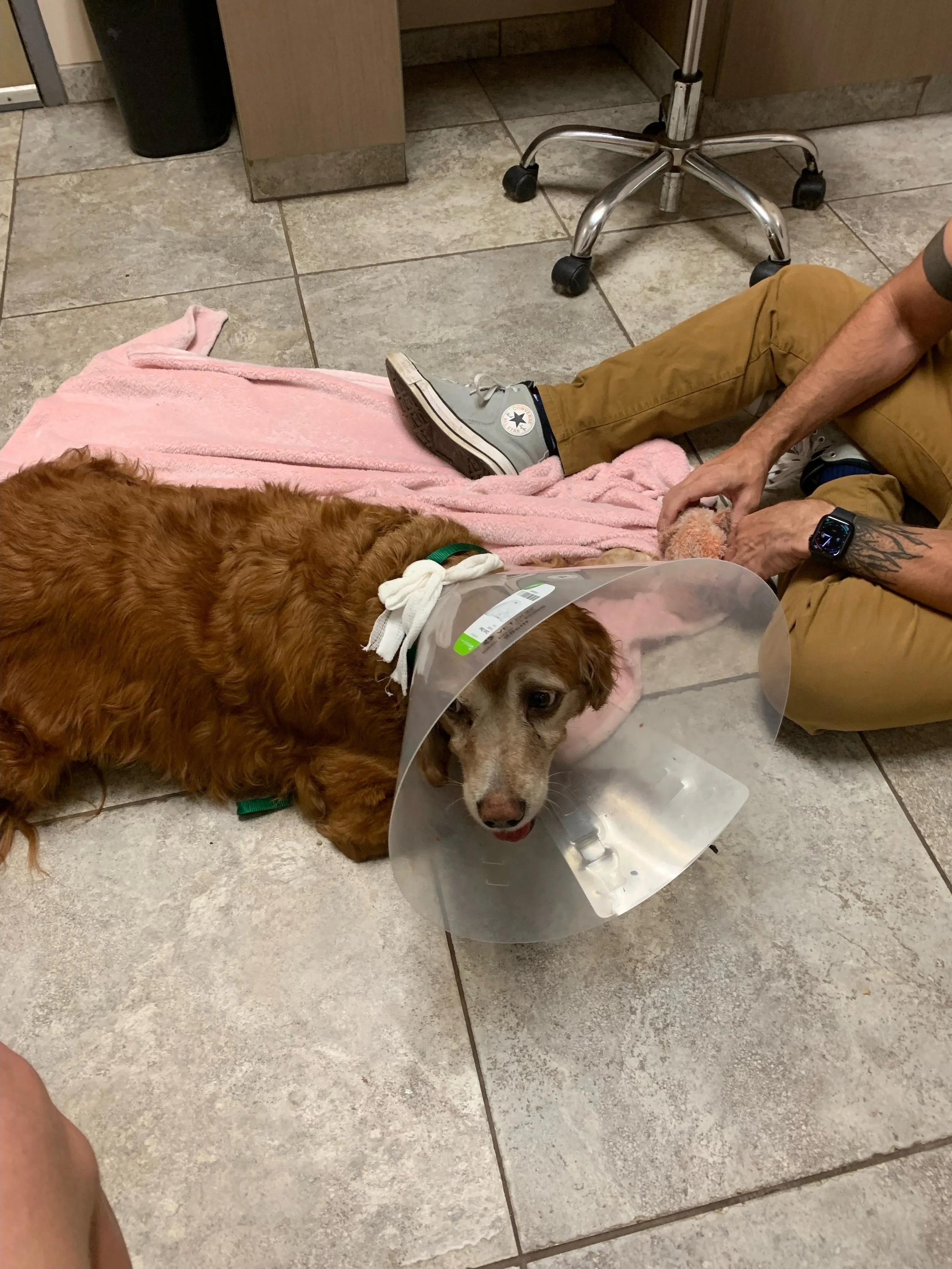We went back to West Ashley Veterinary, and I sat with her and talked with Dr. Badger, and we said the quiet parts out loud. We talked about her pain, and her breathing, and her dignity, and what “comfortable” really means at the end and who the decision is for. And all of us — me, the vet, and honestly Hominy herself, who had this look I will never forget — understood that it was time.