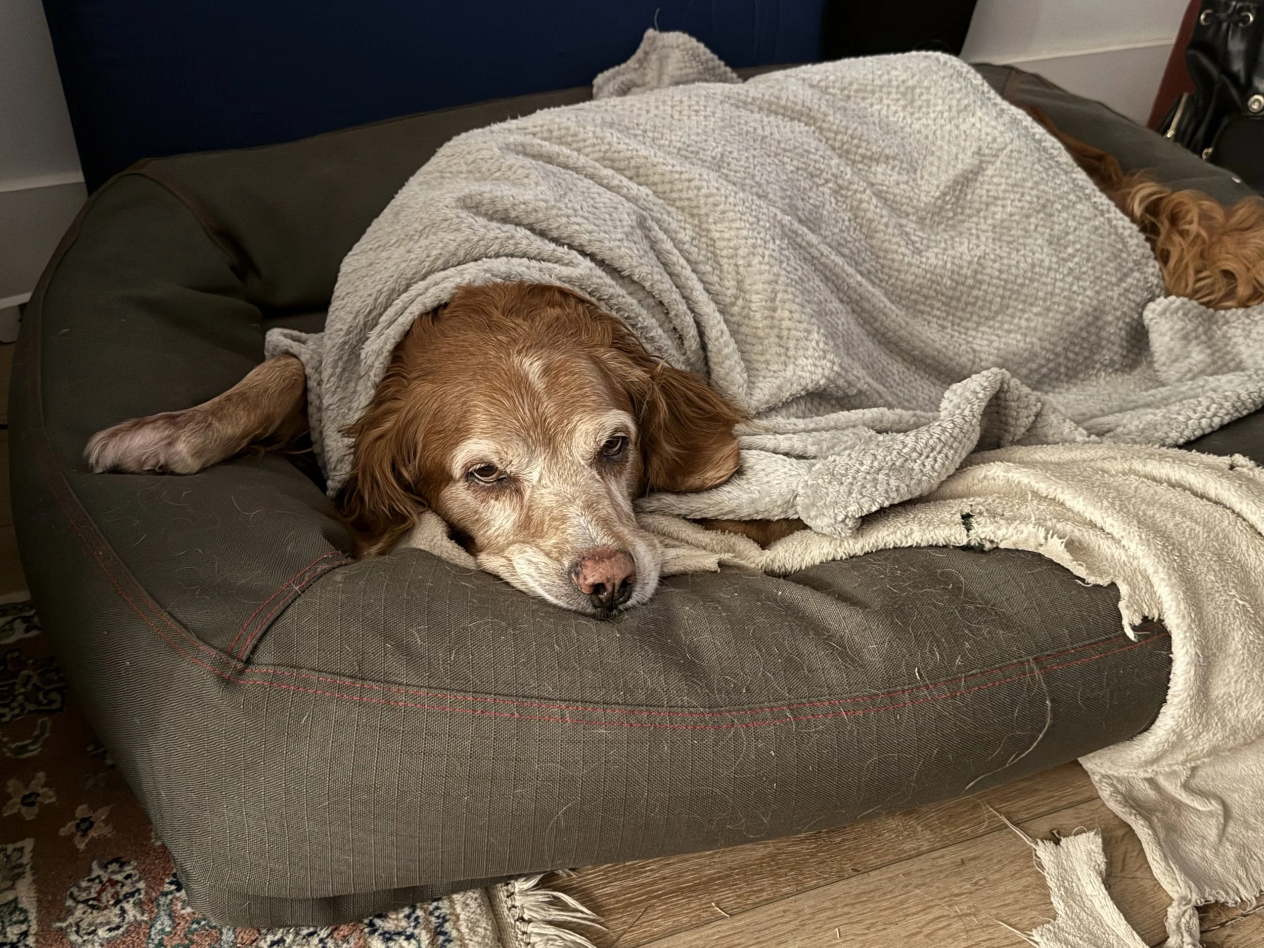 In the last stretch, you could see how hard everything was for her, even in the small everyday acts. Going upstairs was now a two-part mission. She’d pause on the landing halfway, catch her breath, then finish. Going down took full attention, like going down a ladder instead of stairs. If she got too excited, she’d start coughing, these rough little fits that scared me because you could see how much effort it took her to calm back down. The body that had carried her at full sprint across dog parks and down beaches and into every room of my life was getting tired. She was still herself, still loving, still wanting to be with us, still looking for food opportunities like a plump, geriatric criminal mastermind. But she was tired.
