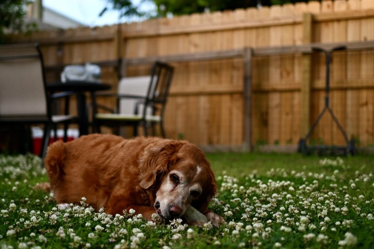 And then there were the kids. Hominy never had pups of her own, but that doesn’t mean she wasn’t a mama. Enter Wyatt and Charlotte. By then she’d started to gray around the face, that lovely sugar-white frosting that older Golden mixes get. Her famous “cannonball down the stairs because it’s breakfast time do not delay” had slowed into a trot, and then into a careful, joint-conscious walk. But the instant those kids showed up, all the years went out of her joints. She would play tug. She would flop in the grass. She would roll belly-up in total surrender joy. You could see her choose energy for them. Dogs know which humans matter. They just do. She knew: these are my kids.