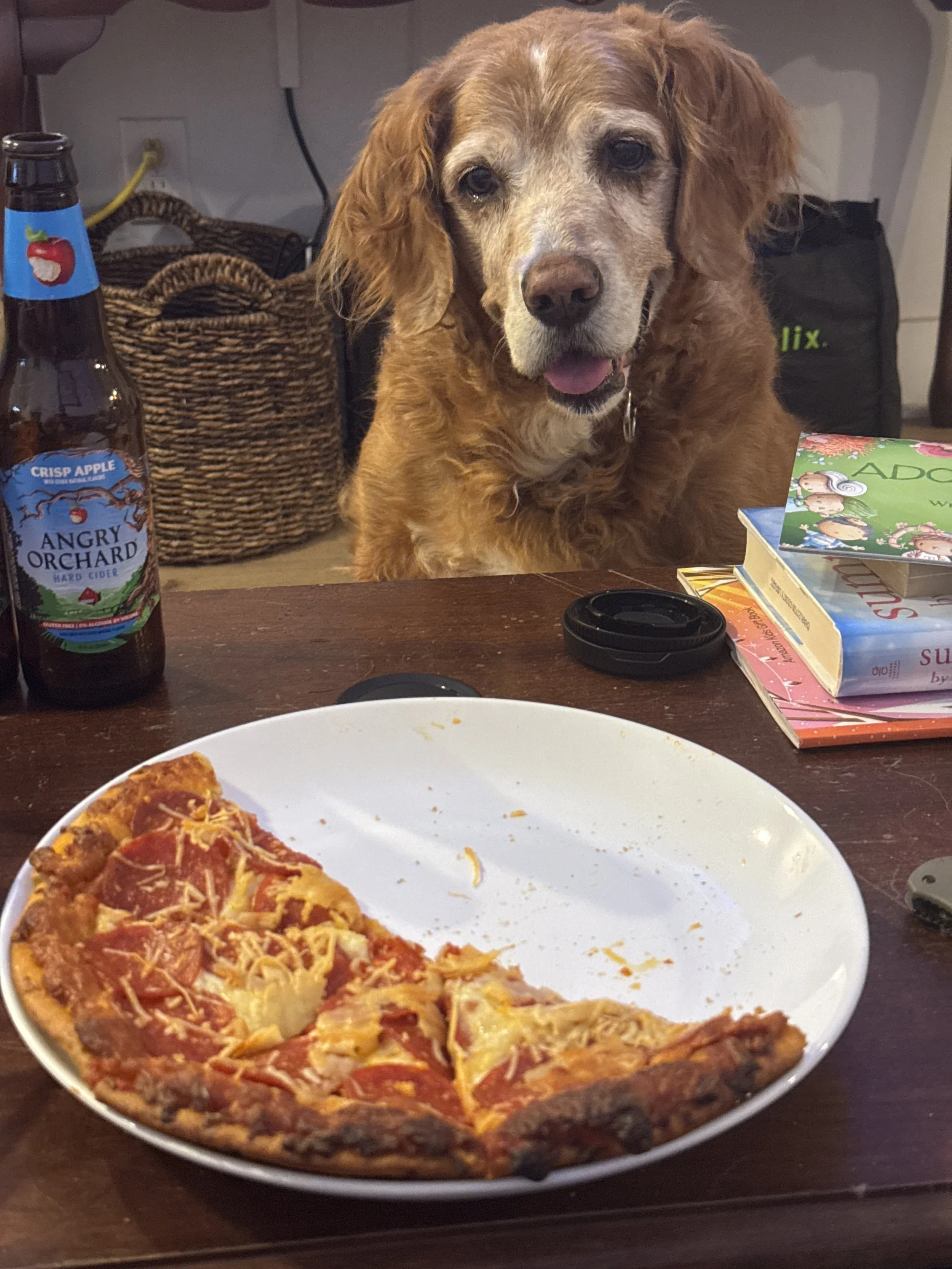 Hominy had a streak in her from the very beginning that can only be described as “ethically flexible.” For her entire life we joked, “She can’t be trusted,” and we said it so often that it basically turned into one of her official titles. “This is my dog, Hominy Louise, a proper Southern lady who cannot be trusted.” But I want to be clear about what that means, because it’s part of her soul. She was never mean. She wasn’t destructive just to watch the world burn. She was simply opportunistic in a way that bordered on strategic genius. If you made the mistake of leaving a plate unattended, even for a few seconds, The Homs considered that an act of surrender. You looked away and, by the ancient laws of dogs, you had clearly abandoned the meal, and it was now salvage. If you didn’t quite push the trash lid down all the way, well, now that wasn’t “trash,” that was “foraging,” and she was, frankly, contributing to the household. And she wasn’t reckless about it. She would wait. She would watch you. She wouldn’t go for the pizza crust while you were looking. She’d wait for you to stand up to grab a drink, and then she’d strike with military precision. It was theft, yes. But it was respectful theft. Elegant, even.